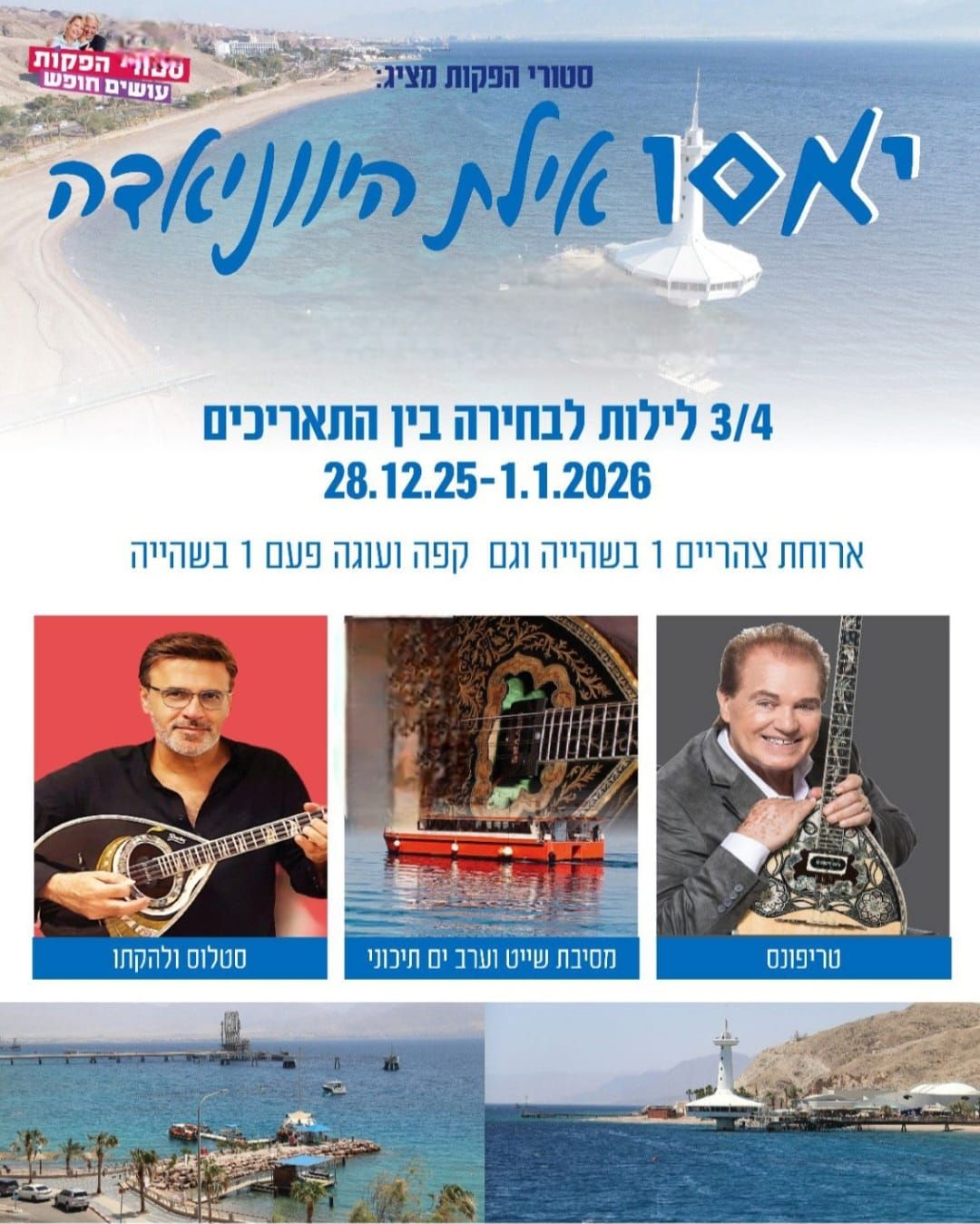 🎉4 לילות של חוויה יאסו באילת! 🌞 המחיר למלון קיסר אילת – על בסיס חצי פנסיון ל 🍽️🍹 📅 28 דצמבר –-ועד 1.1.26 👫 המחיר עבור 2 מבוגרים בחדר 💻 מחיר מיוחד להזמנות באתר בלבד שימו לב: המבצע בתוקף להזמנות חדשות בלבד ועד גמר המלאי. כל הקודם זוכה! החברה רשאית להפסיק/לבטל את המבצע בכל עת וללא הודעה מוקדמת. סטורי הפקות – עושים סיפור מהנופש! 🎭